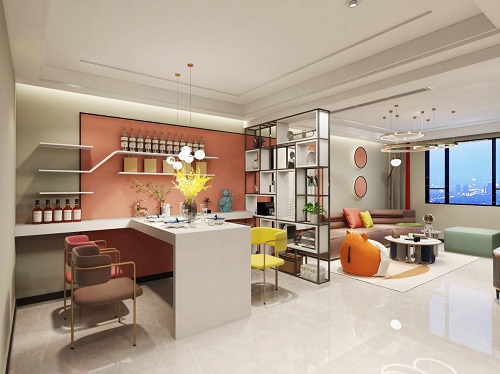 淡淡的灰藍(lán)色,帶著一縷沉靜甚至憂郁的情緒,中間橙色的點(diǎn)綴,渲染了空間的文藝氣息。