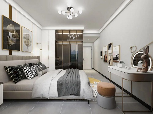 主臥玻璃柜門的衣柜,線條裝飾整個空間,大氣蓬勃的感覺,梳妝臺、床頭柜等家具應有盡有,符合年輕人追求品質生活的設置。
